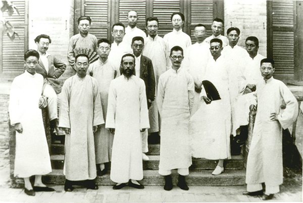 1924年9月北大国学门同仁在三院译学馆前合影,包括一排:董作宾(左一)、陈垣(左二)、朱希祖(左三)、蒋梦麟(左四)、黄文弼(右一);二排:顾颉刚(左二)、马衡(左三);三排:胡适(左二)、徐炳昶(左三)等。