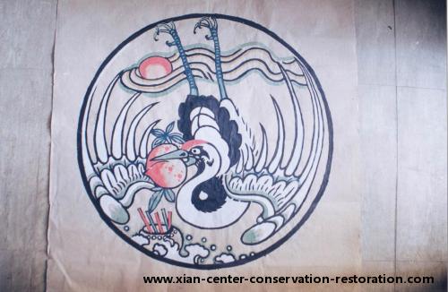 1999年元月,开始对纸画进行实验室保护研究,并制定了详细的保护修复方案。1999年4月29日我们向省局正式提交了西岳庙灏灵殿天花板纸画保护修复方案,得到省局组织的专家论证会的通过,西岳庙文物管理所正式委托我们承担对西岳庙灏灵殿天花板清代纸画的保护修复任务,同时决定对天花板空白处用复制藻井画进行装饰。