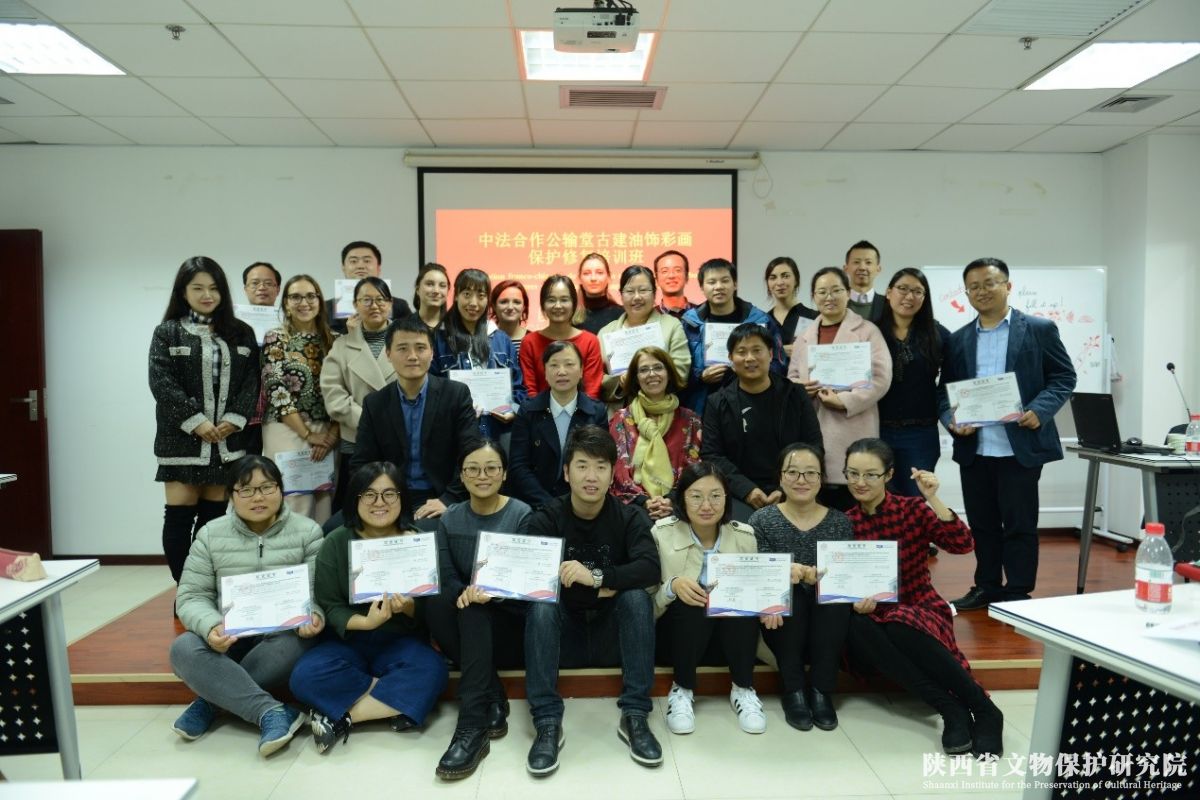 11月1日,由陕西省文物保护研究院与法国国家遗产学院联合举办的“中法合作公输堂古建油饰彩画保护修复培训班“圆满结束。省文保院副院长周萍、法国国家遗产学院教授Claudia Sindaco出席结业典礼,共同为学员颁发结业证书,省文保院院长助理喻刚主持仪式。