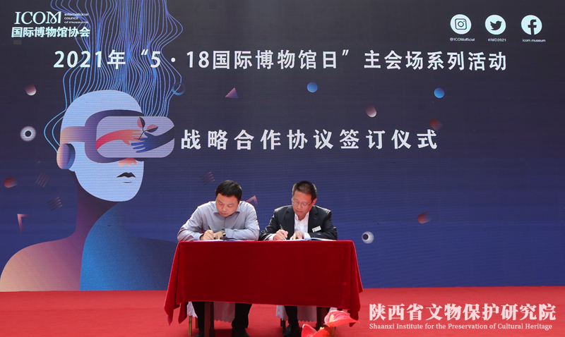 在由渭南市文化和旅游局主办,渭南市博物馆承办的国际博物馆日活动开幕式上,陕西省文物保护研究院党总支书记范桂强致辞表示,今年国际博物馆题的主题“博物馆的未来:恢复与重塑”,与省文保院多年来的工作主旨相契合,省文保院与渭博一直保持着良好的交流合作,未来将继续在文物保护与修复、文物鉴定、陈列设计等多方面加强协作与交流。随后,由省文保院赵昆副院长做代表与渭南市博物馆签订了战略合作协议,发挥省级文物保护机构对地方单位的引领、示范作用,以博物馆为纽带,进一步提高文化实力和城市竞争力。