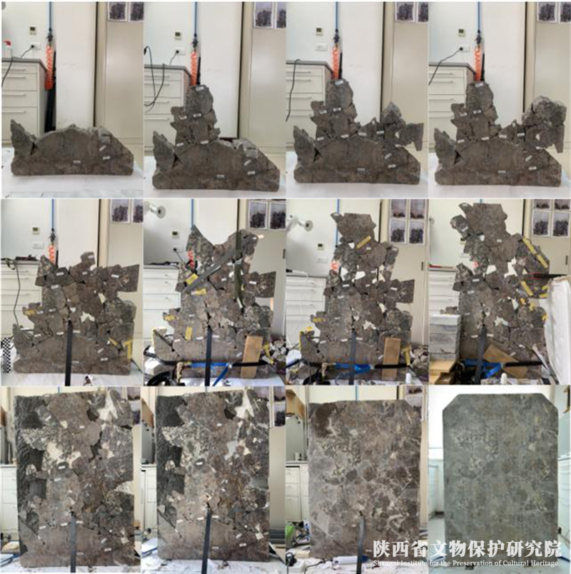 2020年3月,陕西省文物保护研究院受太原市文物考古研究所的委托对《唐朝重修大像阁价钱碑》残碑进行保护修复工作。项目组遵循最小干预、可持续保护、协调性及可辨识性原则,对石碑的保护修复工作有序展开。唐朝重修大像阁价钱碑碎块较多,修复难度较大,期间项目组与太原市文物考古研究所就修复的相关细节进行了积极沟通,于2021年1月完成修复。
