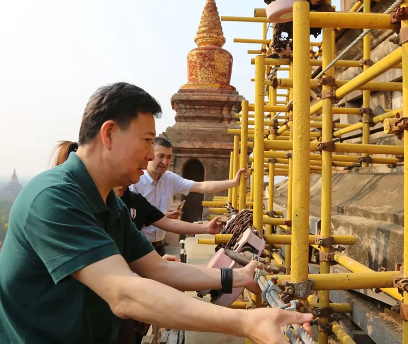 当地时间3月31日,文化和旅游部副部长、国家文物局局长李群率中国政府文化代表团,专程赴援缅蒲甘他冰瑜佛塔保护修复现场,与缅甸宗教事务与文化部副部长杜努妙珊共同调研项目进展,推进相关工作。2016年缅甸发生地震,蒲甘地区佛塔不同程度受损,此后中缅双方共同确认由中国援助缅甸修复其中受损较为严重的他冰瑜佛塔。当日,他冰瑜佛塔保护修复项目总承包单位、管理单位现场负责人一同参加调研并作工作汇报。