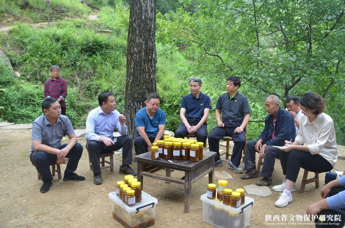 范桂强一行与省文保院驻村干部与和平村村委会干部赴麻河沟现场实地考察,调研了和平村产业示范点土蜂养殖情况,帮助养殖户用传统土法收割蜂蜜,深入了解土蜂养殖的经济情况,开展了消费帮扶活动,范桂强向养殖农户转交了第二党支部积极购买土蜂蜜64斤的消费款3200元。随后,驻村干部与村干部相继介绍了和平村集体产业经济与中草药种植基地建设情况,范桂强听取汇报之后,对驻村队与村干部的工作予以肯定,并鼓励他们努力学习,提高工作能力,为乡村振兴贡献力量。